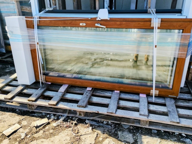 Okno PCV Veka 82 mm trzyszybowe obustronny złoty dąb + biała roleta zewnętrzna, dostępne od ręki